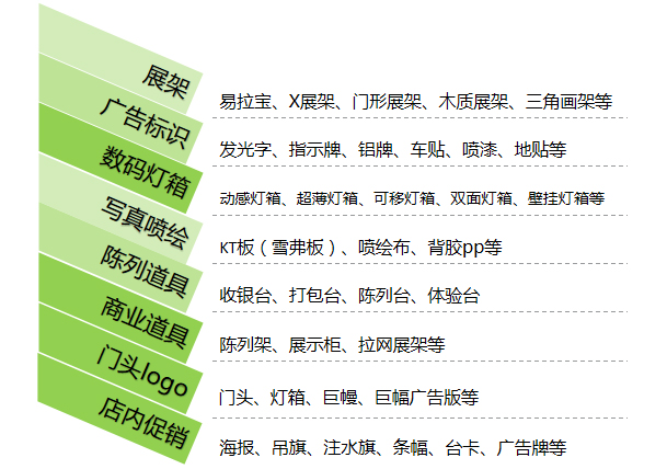 连锁类餐饮店、便利店、美容美发店、药店、水果店、母婴及百货等店面物料制作与安装。涉及喷绘、写真、kt板、条幅、巨幔、双面kt版、车身贴、灯箱片、展架、导引类等物料。